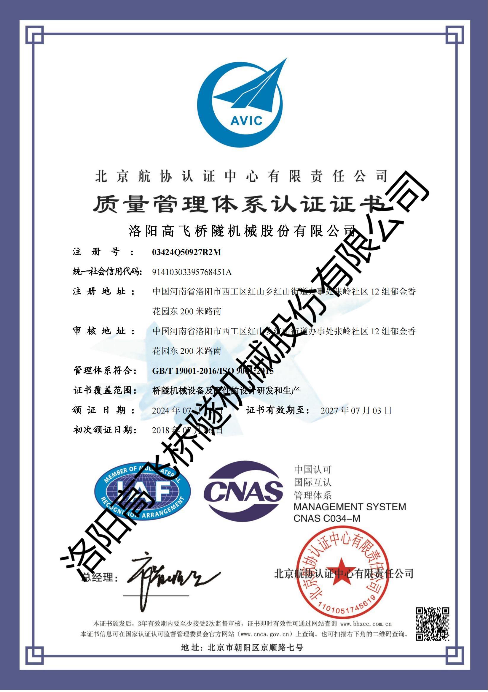 北京航協(xié)質(zhì)量管理體系認證證書